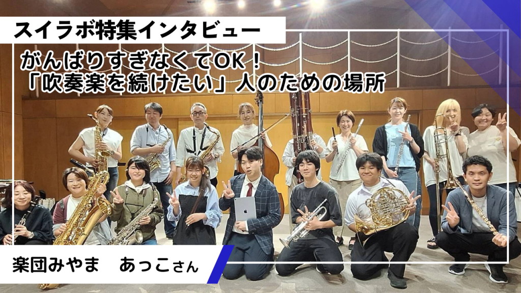【スイラボ特集】がんばりすぎなくてOK。自由参加の吹奏楽団「楽団みやま」の魅力 ― 楽団みやま あっこさんインタビュー「吹奏楽は好き。でも毎週の練習はしんどい…」 「久しぶりに楽器を吹きたいけど、… -