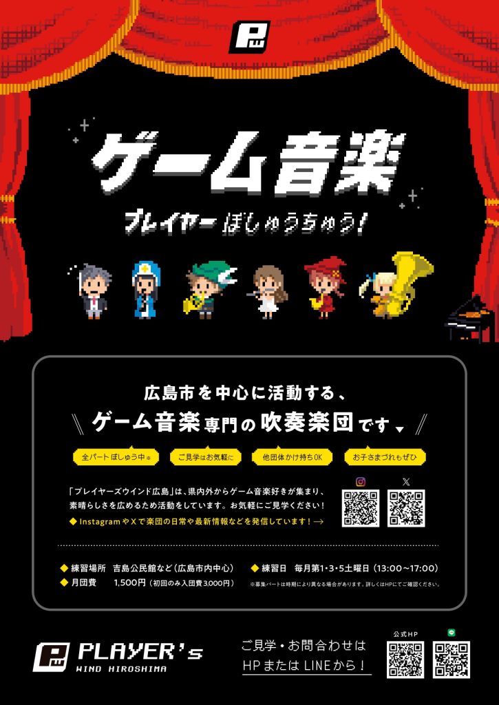 私たちは広島市を中心に活動するゲーム音楽専門の吹奏楽団です! 県内外から集まったメンバーと共に、大好きなゲーム音楽を演奏しています。 演奏を楽しむのはもちろんのこと、レンタルスペースを借りてゲーム大会を開くなど、演奏以外でもワイワイ活動しています♪ 普段なかなか演奏機会のないゲーム音楽を、同じ志を持つメンバーと一緒に演奏してみませんか? ゲームにあまり詳しくないから心配…という方でも大歓迎です! 全パート募集しておりますので、少しでも気になった方はお気軽にお問い合わせください☻